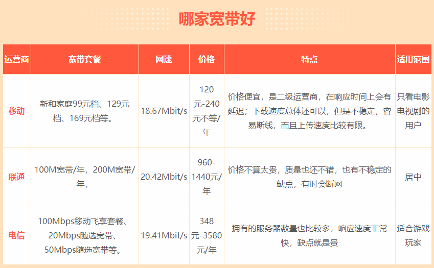 大家都希望宽带上网稳定、速度快、价格公道,目前,主要由移动、联通、电信这三大运营商占据市场,大部分用户都是选择这三个运营商之一的服务。这三大宽带运营商各有特点,用户要根据自身使用是玩游戏、看电影视频还是下载文件等偏向选择合适的运营商。那么宽带服务哪家好呢?宽带套餐资费标准是什么?下面一起来看看宽带的有关知识。